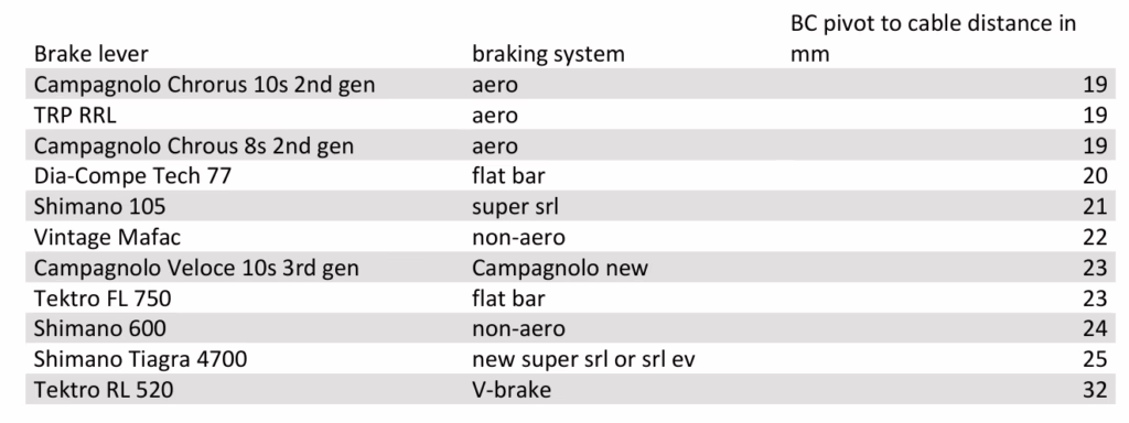 The common wisdom is that aero levers have more mechanical advantage than non-aero ones since you’re suddenly also braking from the hoods and not just the drops which reduces the AB distance discussed above and mechanical advantage on that side of the equation. That seems to be the case: the non-aero Shimano 600 has a BC distance of 24mm and the aero offerings have a BC distance of just 19mm. An interesting case is the vintage Mafac lever with a BC distance of just 22mm. I think the explanation is that the lever was actually designed to be used with cantilever brakes (and centerpulls) unlike any of the others.